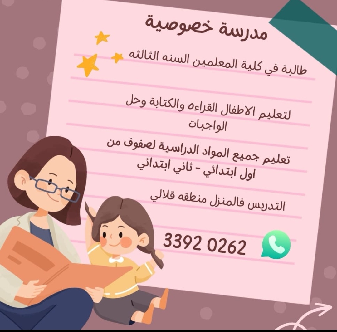 مدرسة خصوصية طالبة في كلية المعلمين السنه الثالثه لتعليم الاطفال القراءة والكتابة وحل الواجبات تعليم جميع المواد الدراسية لصفوف من اول ابتدائي - ثاني ابتدائي التدريس فالمنزل منطقه قلالي 3392 0262