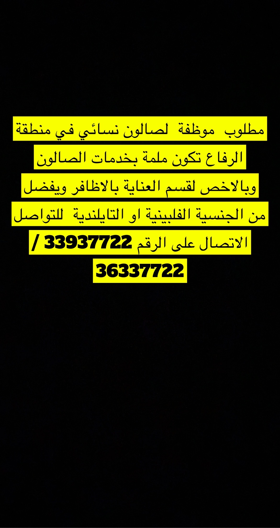 مطلوب موظفة لصالون نسائي في منطقة الرفاع تكون ملمة بخدمات … تبليغ سؤال Eman7722 مطلوب موظفة لصالون نسائي في منطقة الرفاع تكون ملمة بخدمات الصالون وبالاخص لقسم العناية بالاظافر ويفضل من الجنسية الفلبينية او التايلندية للتواصل الاتصال على الرقم 33937722 /36337722 يرجى شرح بإيجاز لمإذا تشعر أنك ينبغي الإبلاغ عن هذا السؤال. تبليغ إلغاء