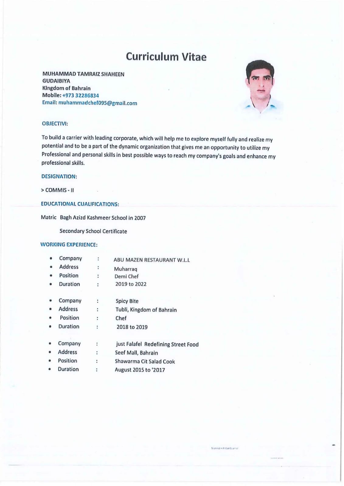 hi good morning sir or madam I am Muhammad Tamraiz sahaheen from Pakistan I have11 years experience in bahrain as chef or cook and driver now I need job urgent please help me